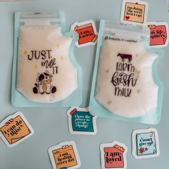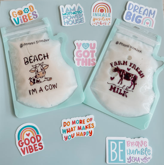 25 Hand-Drawn Milk Storage bags using non-toxic markers. The sample pack includes 5 stickers of affirmations that can be used on water bottles, pumps, mirrors, and more. More details below under description.